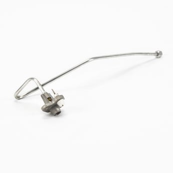 Surface burner igniter and orifice holder 316237707 includes the orifice holder that directs the gas flow to the burner head and the igniter electrode that produces the spark that ignites the gas.