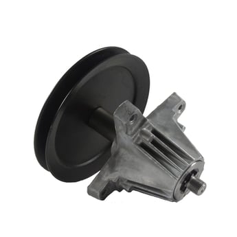 Mandrel and pulley assembly 918-04865A provides support for the pulley shaft and spins the blade on the mower deck of the lawn tractor. The assembly includes the pulley, mandrel housing, mandrel shaft and bearing.
