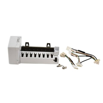 Ice maker 4317943 includes the ice mold and the control device. The ice maker receives water from the water inlet valve and then holds the water in the ice mold until the water freezes solid. It then automatically ejects the ice and refills to continue the process until the ice storage bin is full.