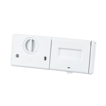 Detergent dispenser assembly 5304460911 holds the dishwasher detergent and rinse agent in covered compartments.