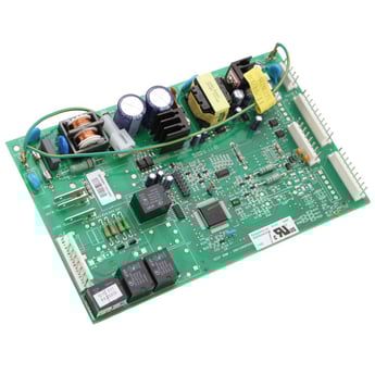 Electronic control board WR55X10968 manages the functions of the refrigerator such as cooling and defrost times.